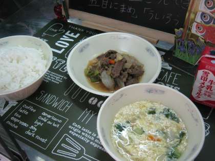中華コーンスープは,卵を入れてまろやかに仕上げました。コーンや新玉ねぎのあま味がおいしいスープです。子どもたちにも人気のスープでもっとほしい!という声がたくさんありました。