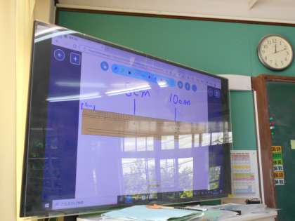 まず,ものさしの絵のカードをロイロノートで全員に送りました。ものさしの絵を拡大して,1センチの中に10めもりあることを確認しました。みんな自分のタブレットのものさしを拡大してめもりを数えていました。