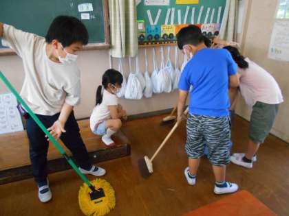 2年生は,掃除の時間になると,廊下の窓や床をふいたり,洗面所をたわしで磨いたりするのを頑張っています。教室でも,ごみを集めたり,モップで掃除したりしています。机も重いですが,一生懸命運んできれいにふいています。