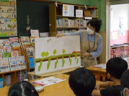 2年生は,図書の学習で,学校司書の荒木先生に「999ひきのきょうだい」の絵本の読み聞かせをしていただきました。
