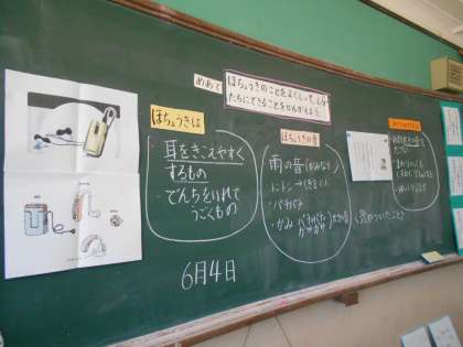 子どもたちは,補聴器を体験して思ったことを発表したり,自分たちのできることを考えたりすることに真剣に取り組んでいました。