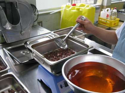 今日は北海道でとれた金時豆を使い,甘煮にしました。金時豆をやわらかく煮た後,ホテルパンに入れて煮汁と合わせます。その後,スチームコンベクションオーブンで40分かけて味を染み込ませ,少し冷ましてさらに味を染み込ませます。