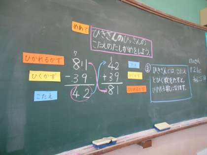 2年生は,算数科で「ひき算の筆算の答えのたしかめかたをかんがえよう。」というめあてで学習しました。