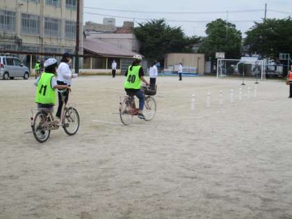 運動場に道路を見立てたコースをつくり,道路での走行の仕方,信号機や横断歩道の前でどうするのかなどを習い,実践しました。ジグザグコースや,ゆっくり自転車を操作して走るチャレンジコースも体験しました。子どもたちは,慎重に懸命に自転車を運転していました。