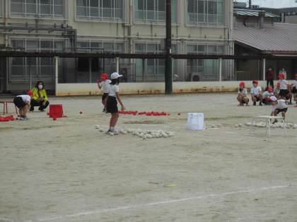 「どっちがたくさん入るかな?玉入れレース」は、なんとかごに入った玉が赤・白、同じ数になってしまいました。勝敗を決めるために延長戦に。