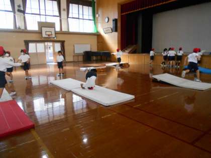 マット遊びでは、前回りや後ろまわりや側転などいろいろな技にチャレンジしています。