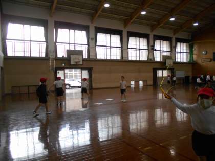 今日は、雨が降ったので、体育館で、3分間自分のペースで駆け足をしました。その後、いろいろな縄跳びのわざにチャレンジしました。みんな、なわとびがとても楽しいようで、休み時間にも友だちと仲良く練習していました。