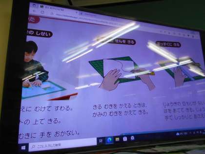 今日は,カッターの使い方を学習しました。子どもたちは,安全に気を付けて,直線・曲線・窓の形などを,カッターで切る練習をしました。