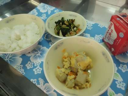 大豆は肉に比べて、育てるのに必要なエネルギーや水の量が、少ない食べ物です。今日の給食では、大豆から作られる高野どうふや油あげにくわえ、旬のしいたけを使いました。高野どうふの卵とじはおかわりしたい人がたくさんおり、あっという間に食缶が空っぽになっていました。