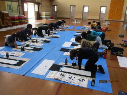3年生から6年生の書写の時間に、画仙紙に文字を書く学習をしました。書き初めなどで書く長い紙です。体育館で授業を行いました。