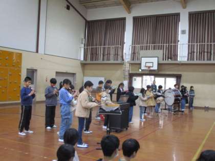 本日、5時間目に「6年生を送る会」を開きました。各学年から、素敵なプレゼントが贈られました。1年生は、「こいぬのマーチ」の合奏に、6年生へのメッセージをこめた替え歌。2年生は、6年生へのありがとうの気持ちをこめたオリジナルの詩の発表と「ツバメダンス」。3年生は、6年生へのたくさんの「ありがとう」の言葉と、「パフ」の合奏。4年生は、「ジッパディードゥーダー」の合奏と6年生との思い出の替え歌。5年生は、「威風堂々」の合奏と「ありがとう」の大きなメッセージカード。6年生は、「かわいいなあ」「おもしろいなあ」と笑顔で、時には一緒にリズムをとりながら楽しそうに聞いていました。
