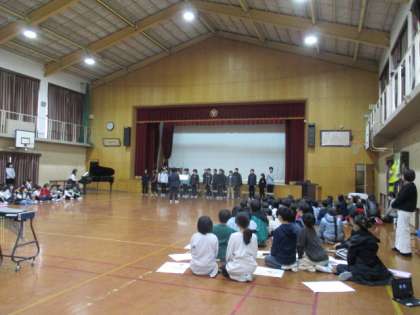 6年生からは、楽しい劇と歌のお返しがありました。6年生らしい落ち着いた声が体育館に響きました。そして、各学年を応援するメッセージもありました。