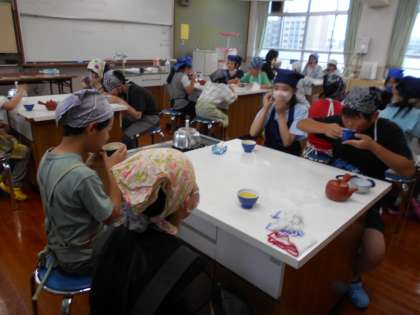 お茶がいれられた班から飲んでみると「にがっ」と煎茶の苦さに驚いている子もいれば、「おいしい!おかわりしたい!」と喜んでいる子もいました。初めての調理実習、楽しく活動できてよかったですね。