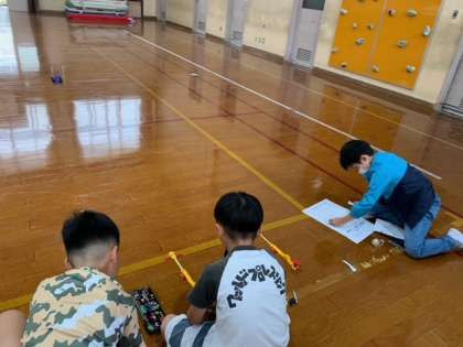 ゴムは、5センチ→10センチ→15センチの順に長さを変えます。実験はなるべくデータを多く集めるためにそれぞれの長さで3回ずつ行い、どれくらい動いたのか結果を記録しました。