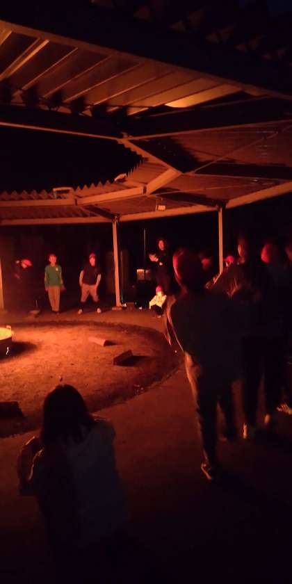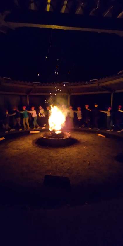 山の家のお楽しみ、キャンプファイアーです。ファイアーの火を囲み親睦を深めています。