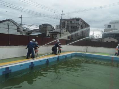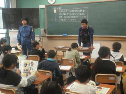 先週に引き続き今週も4年生は防災の学習でゲストティチャーに来ていただきました。今日は南消防署と地元の消防団の方々にお世話になり人命救助の学習をしました。日々の活動の様子を知ることや放水体験を通して、大変さを感じたようです。