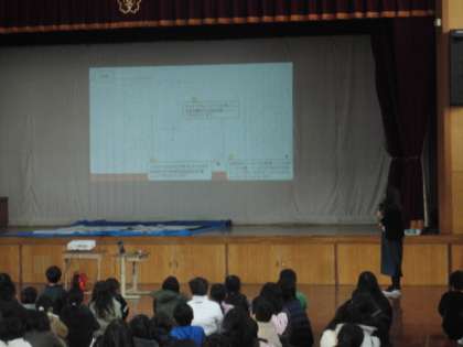 始業式の後、全校児童の前で各学年のあすいきノートの交流を行いました。実際に子ども達のあすいきノートをプロジェクターで提示し、担任の先生から、ノートの良い点や工夫されているところの紹介がありました。みんなのノートを参考にして、計画的に取り組んでいき、学びを楽しんで欲しいと思います。