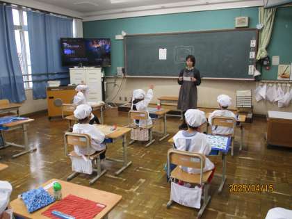 初めての給食当番にも苦労しながら、6年生のお兄さん、お姉さんに手伝ってもらい、自分たちの役割を覚え、協力して給食の準備を行うことができました。