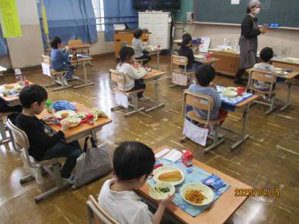 自分たちで配膳を行った給食に、子どもたちは「おいしい。おかわりください!」と口の周りにミートソースをつけながらも、嬉しそうに味わって食べていました。これからも香り、食感、彩りなどを味わいながら、たくさんの食材に出合えるよう、給食を楽しんでいってもらいたいです。
