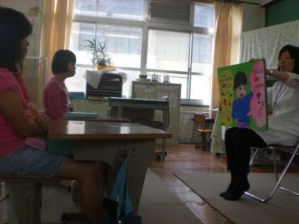 今回のテーマは「好きなものばかり食べないで」です。紙芝居を読んでいただき、食べ物には、赤色や黄色、緑色のグループに分けることができて、それぞれのグループは、体のいろいろな働きがあるということを学習しました。