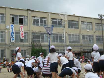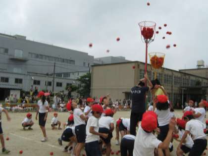 高いかごと低いかごの2つに入れ得点を競い合う玉入れです。