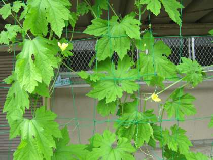 「緑のカーテン」で涼しげに葉を茂らせているゴーヤに花が咲きました。
