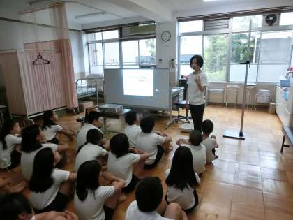 来週に実施する“ピカピカしらべ”(染出し錠を使用して,みがき方や歯の健康について学習します。)に向けて,2計測の前に,むし歯になりにくい丈夫な歯を守るための話をしました。