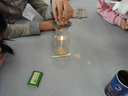 「ものが燃える時に必要なものは?」今日はろうそくに火をつけてビンの中に入れ,ふたをするとどうなるか実験をしました。ふたを開けると?閉めると?どれくらい開けておくと燃え続けるの?といったことについて条件を変えながら実験をしました。これからいろいろな実験を通してものが燃えるために必要なことは何かということについて考えていきます。