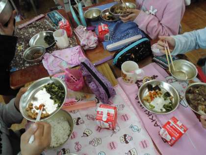 毎日給食の時間を楽しみにしている6年生。今日の献立は牛丼の具,五目煮豆,大根葉のごまいためでした。給食の時間には食感も楽しむことができるよう,意識して食べています。いただきますのすぐあとには静かにして噛んでいるときの音を楽しんでいます。シャキシャキが聞こえるおかず,コリコリという音がするおかずなど様々です。マナーに気を付けて残さず食べるだけでなく,栄養のバランスや,食感などの食材についても考えることができるようになってほしいと思います。
