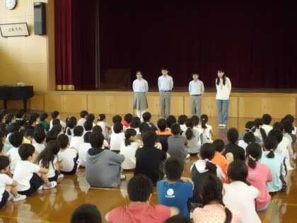 5月13日は,児童朝会がありました。全校生徒の前で,九条中学校の2年生の3名の先生方は自己紹介をりっぱにしてくれました。その後,今日は担任の先生だけでなく様々な先生について体験をしてくれました。校内の環境整備や,給食の時間は給食室前で手洗いの声かけなどをしてくれました。