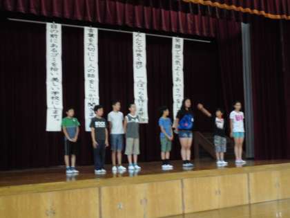 今週,児童朝会がありました。計画委員会の子たちからの九条弘道人権宣言を聞いたあと,各学級の学級目標の発表がありました。6年生も代表者がしっかりと発表してくれました。学級目標通り,何事にも全力で取り組んでいきましょう!