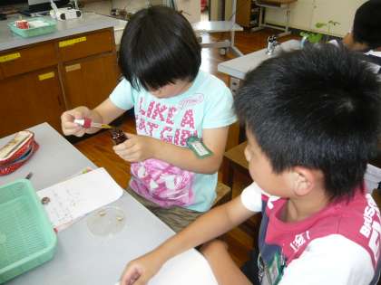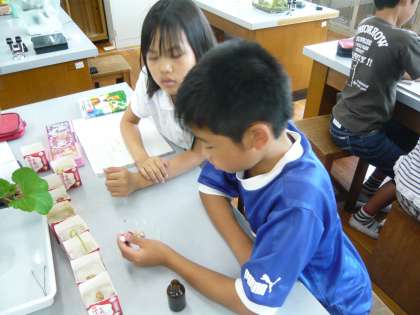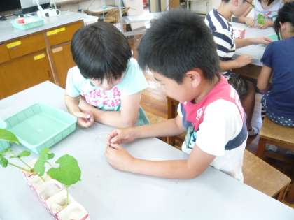 理科では,植物の種子にデンプンがあるのかどうかを調べました。発芽していない種子にヨウ素液をかけると青紫色に変わり,デンプンがあることがわかりました。しかし,発芽してしばらくしてからの子葉には,ほとんど養分が残されていないことが分かりました。