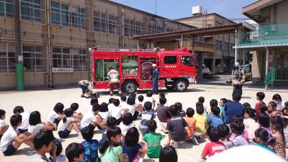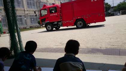 避難訓練があり、そのあと消防の方が残ってくれて、消防車を見せてくれました。2年生と1年生は消防車を見て絵を描きました。よく見て丁寧に描こういうめあてで描きました。横から見たり、斜め前から見たりして描きました。来週は、はじめて絵の具を使って、消防車をぬりたいと思います。