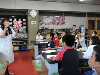 グループで協力していろいろな実験をしました。中学校で学習するような水の分子についても模型を使い分かりやすく教えてもらいました。