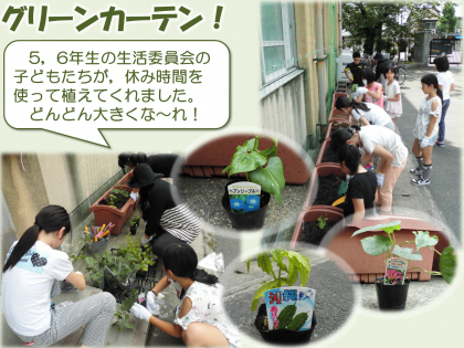 環境学習の一環として,今年も「グリーンカーテン」作りに取り組みます。生活委員会のメンバーが中間休み,昼休みを使って苗を植えてくれました。お世話もみんなでがんばります。大きく育つのが楽しみです!