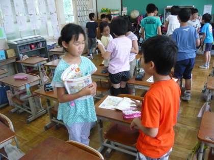 外国語の学習で,数を友だちに聞く活動をしています。積極的にかかわっています。