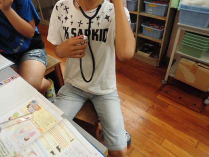理科では体のつくりの学習をしています。今日は心臓のはたらきや血液についての学習をしました。はじめに,聴診器を使って心臓の音を聞いてみました。「動いてる音が聞こえる!」「トントンっていってる。」などと自分の鼓動に興味津々の様子でした。手首に聴診器をあてて脈を打つ音を聞いている子もいました。