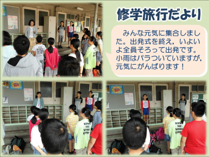 いよいよ待ちに待った修学旅行当日の朝です。雨は少し降っていますが,わくわくした笑顔でみんな時間どおりに集まりました。出発式では,「みんなが笑顔になるために責任のある行動をしよう」というめあてを確認しました。バスに乗り込み,たくさんの見送りの中,元気に出発です!