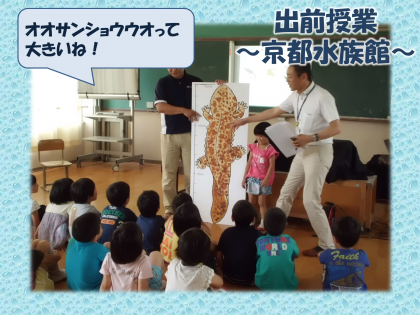 1年生と2年生が,京都水族館の方々による出前授業の学習に挑みました。環境教育の一環としてお越しいただいたのですが,天然記念物である「オオサンショウウオ」をテーマにその生態や体のしくみなどをわかりやすく教えていただきました。