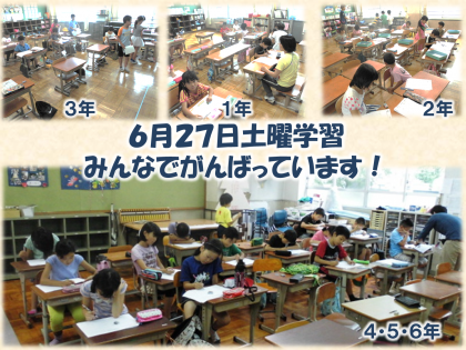 6月27日,土曜学習を行いました。今日はなんと全校児童の6割近くにあたる約60名の子どもたちが参加してくれました。算数と国語の学習を中心に,集中して取り組んでいます。友だちのがんばりを見て,「よし,自分も!」とみんながやる気をもって取り組む姿はとても立派です!