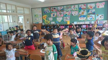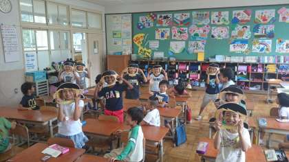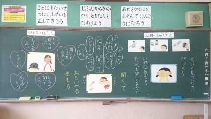「ねえ、聞いて」という紙芝居を読み聞かせました。そのお話の主人公の気持ちを考えることを通して、聞くことの大切さを考えていきました。聞いてもらったときの気持ちを顔で表したり、嬉しさを体で表現したりしました。元気一杯に表現して、聞くことの大切さを感じることができました。そして「聞くことは相手を思いやること」ということに気づくことができました。