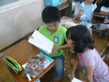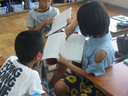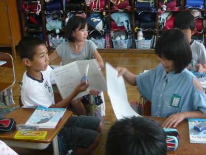 算数科では,合同な図形の学習をしています。今回は自分がどのようにして合同な三角形をかいたのかを友だちに説明しています。分かりやすく説明するために,自分のかいた絵を指し示して説明をしています。