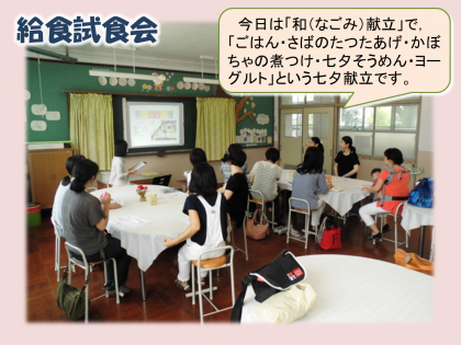 給食試食会を開きました。栄養教諭の芹口先生から給食についてのお話を聞いた後,みなさんで給食をいただきました。今日は大変暑い一日ですが,涼しげな七夕献立をみなさんでおいしく味わっていただきました。