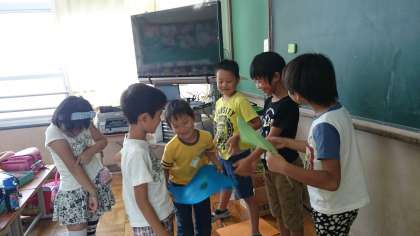 飾りに使う絵の色を上手にぬれたことで4人の子が表彰されました。
