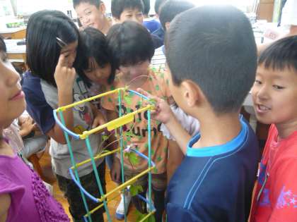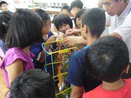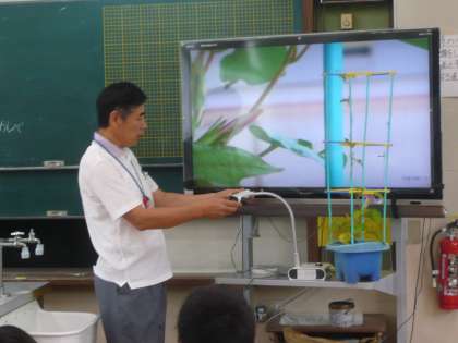 理科では,アサガオの花を使って受粉について学習をしています。今回は咲く前の花と咲いている花,咲いた後の花のおしべとめしべの様子について観察しました。咲く前の花のおしべは短く,咲いた後のおしべは長く伸びていることが観察をしてわかりました。