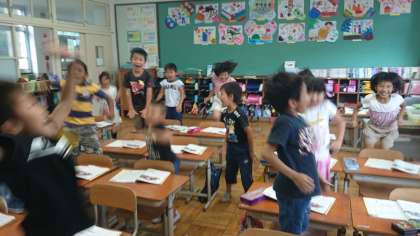 音符の拍数を歌いながら体感しました。全音符、2分音符、4分音符、8分音符の長さをジャンプの大きさで表しました。歌を歌いながらジャンプして、楽しく学習できました。