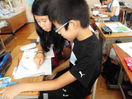 円の面積の公式を学びました。その後,複雑な図形の面積の求め方をみんなで考えました。「えー,こんな形の面積求める公式ない・・・」と初めは手が止まっていましたが,図に線を描きこんだり,友達と相談したりする中で「あっ!あの公式使える!」「ここに線を引いたら三角形になる!」などと発見をし,式を立てて答えを出していました。学習したことをいかに使うかが大事です。悩みながらも答え合せの後にはみんなすっきりした表情になりました。