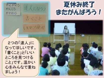 まだまだ暑い日が続きます。「早寝・早起き・朝ごはん」のリズムをご家庭でもきちんと保てるようにご指導お願いいたします。