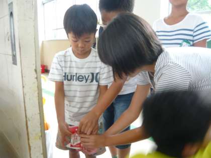 給食の時間に,新しくなった牛乳パックのたたみ方を1年生に教えてあげました。これまでと違い,パックを開かずにたたむ方法を,分かりやすく教えていました。