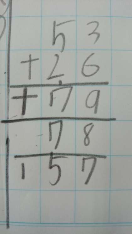 たし算のひっ算で,3つの数を足す筆算が出てきました。